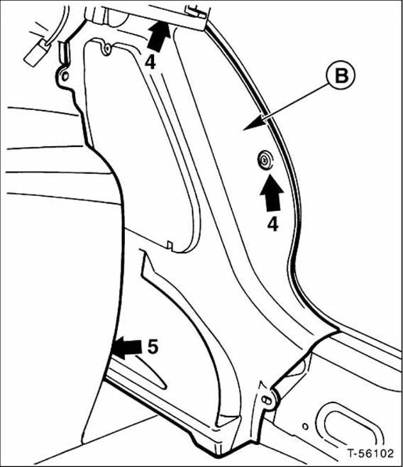 Seitenverkleidung - b - ausbauen. Dazu kreuzschlitzschrauben - 4 - herausdrehen und bei der linken verkleidung clip - 5 - mit kleinem schraubendreher heraushebeln.