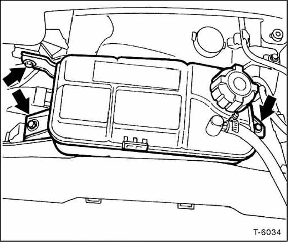 Kühlmittel-vorratsbehälter abschrauben und mit angeschlossenen schläuchen zur seite schieben.